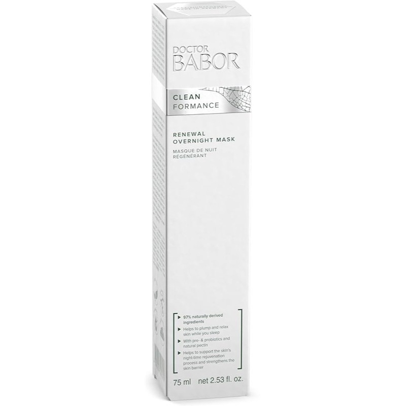 BABOR Cleanformance Renewal Overnight Mask är en rik och krämig ansiktsmask som suddar ut linjer och behandlar din hud medan du sover. Innehåller naturligt pektin från äpple som boostar våra naturliga återfuktande faktorer i huden (NMF). Ett komplex av pre- och probiotika tillsammans med ett barkextrakt från rödlönn från hållbara odlingar, ökar hudens fasthet och elasticitet samt förebygger för tidigt hudåldrande.