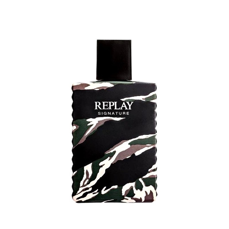 Med sin innovativa design strävar Replay Signature efter att överföra andan från Replay modekollektion till parfymvärlden. Den institutionella formen på flaskan förstärks av reliefer på båda sidorna. Kamouflagemotivet pryder hela flaskan och gör den mycket iögonfallande. Doften är den nya pulserande sensualiteten för män. Den förför omedelbart med sin karakteristiska första not av rosépeppar, bekräftad av frisk bergamott och varm kanel. Aromatiskt mintigt geranium och stark muskotnöt utvecklar en kraftfull maskulin kryddig blandning, harmoniserad av balsamisk ros och torrt cederträ. Basen är gjord av ädla träslag, vilket ger styrka och värme till doften tillsammans med delikata toner av amber-mysk.