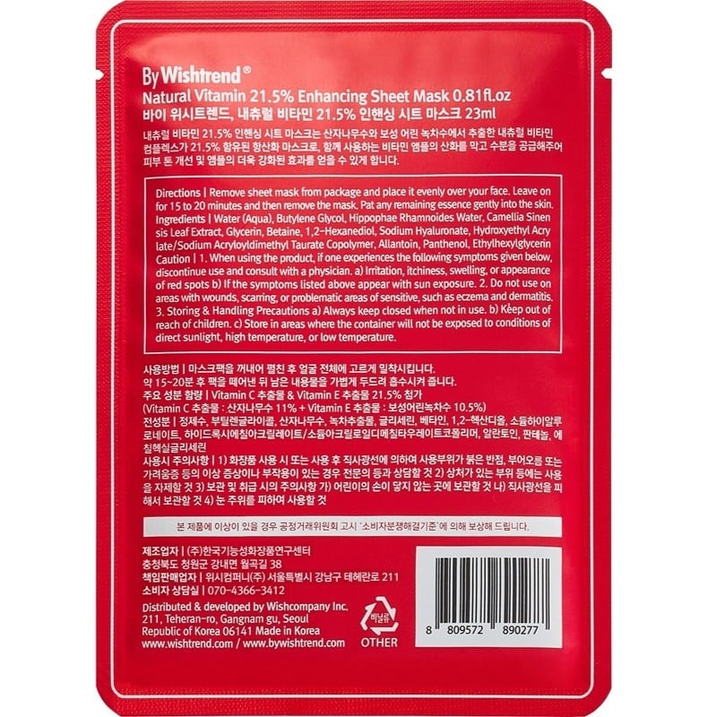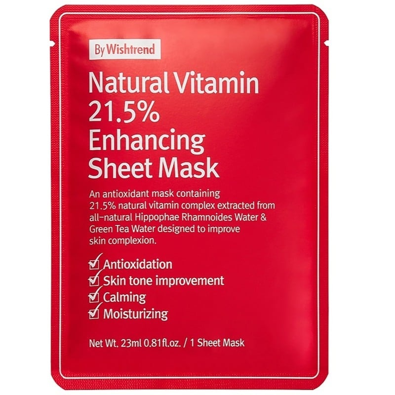 By Wishtrend Natural Vitamin 21.5% Enhancing Sheet Mask maksimoi ja tehostaa C-vitamiinin vaikutusta. Se sisältää 11 % C-vitamiinia ja 10,5 % E-vitamiinia. Naamio parantaa ja vahvistaa C-vitamiiniseerumin tehoa. Kosteuttaa ja rauhoittaa ihoa 11 % C-vitamiinilla ja 10,5 % E-vitamiinilla.