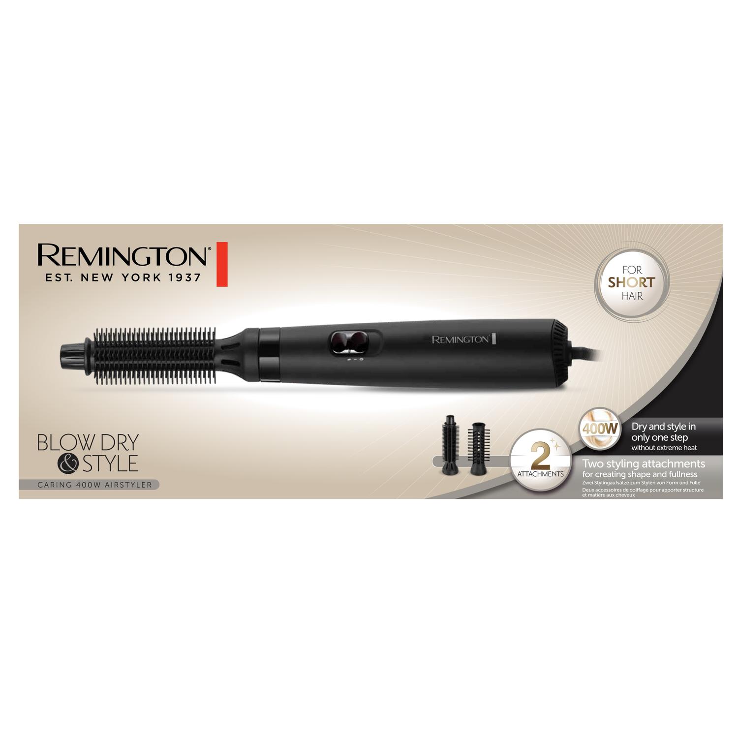 800 W kuumailmaharja, joka on sovitettu ihmisille, joilla on lyhyet ja keskipitkät hiukset. Valitse kahdesta lämpö-/nopeusasetuksesta sekä kylmäilmatoiminto hiusten kiinnittämiseen.