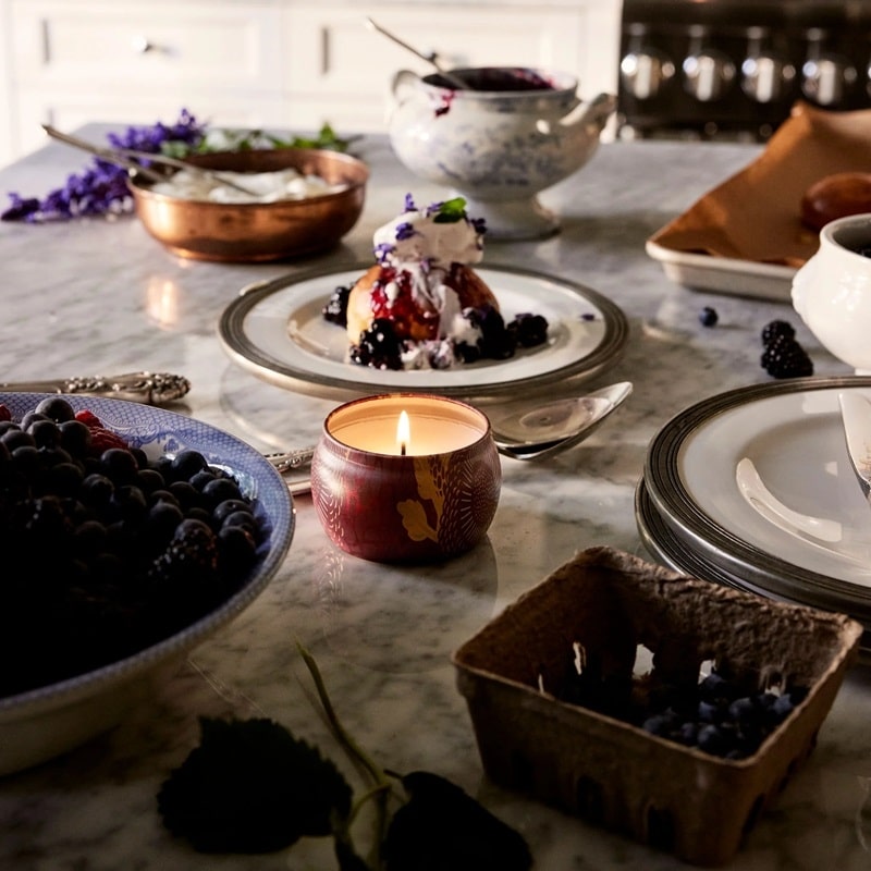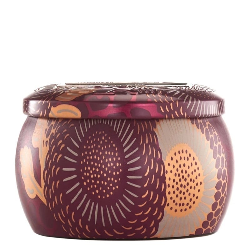 Voluspa Decorative Tin Candle Foraged Wildberry sisältää täyteläisen tuoksun pudonneista lehdistä, kultaisesta meripihkasta ja kypsistä marjoista.